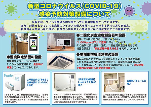 当院では、新型コロナウイルス(COVID-19)感染予防対策として万全の態勢をとっております。